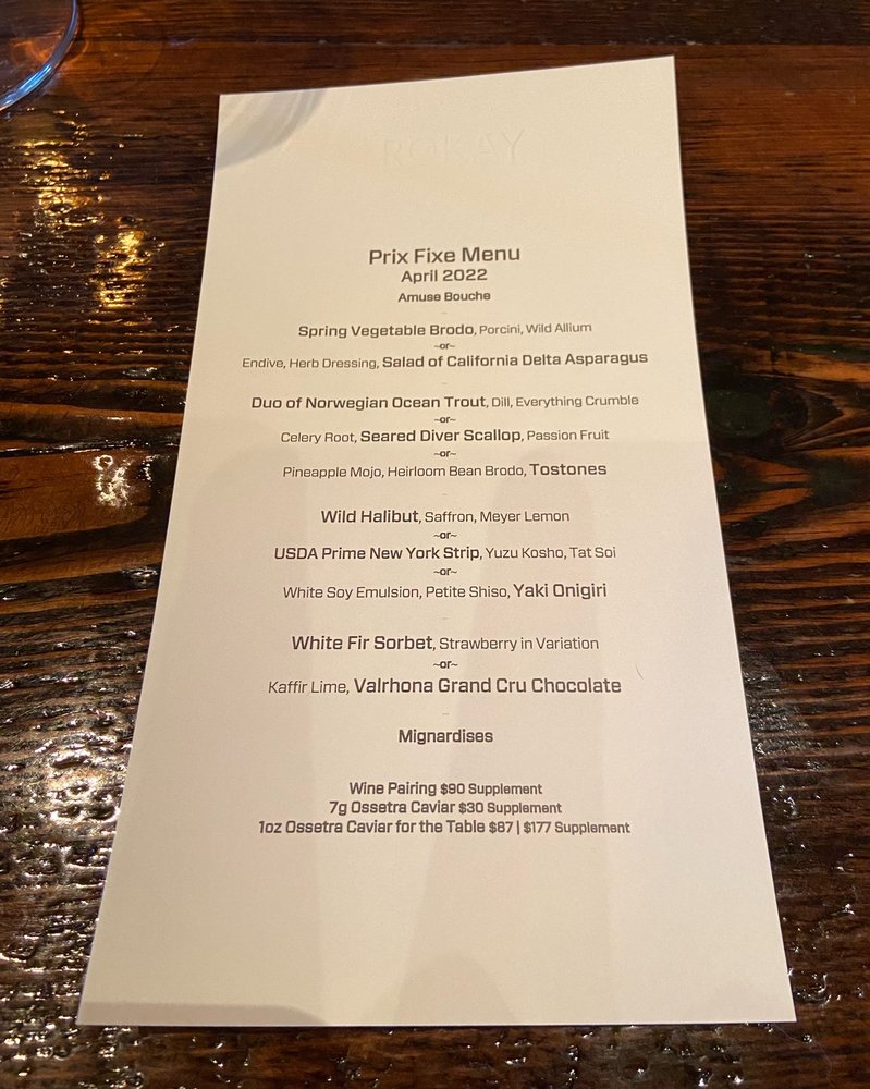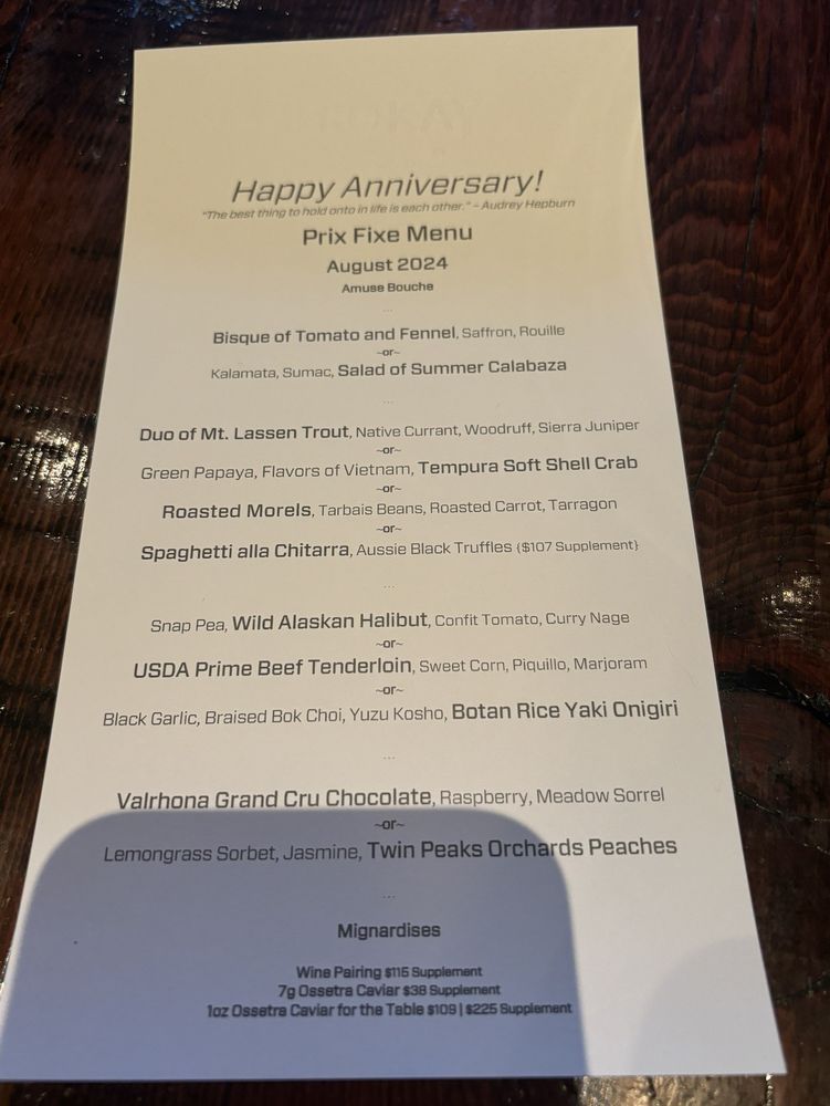 Welcome to Trokay, a hidden gem nestled in Truckee, California, where New American cuisine takes center stage. This culinary haven captures the essence of fine dining with its meticulously crafted tasting menus. Highlights include the Snow And Ice and luxurious Tournedo Rossini Dagneau, paired perfectly with inventive sides like Sweet Potato Miso Bisque and the vibrant Salad of Freshly Cut Nasturtium.